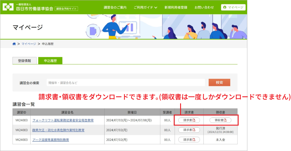 登録者ログイン後の「マイページ申込履歴」から受講費用の請求書・領収書のダウンロードが可能です。